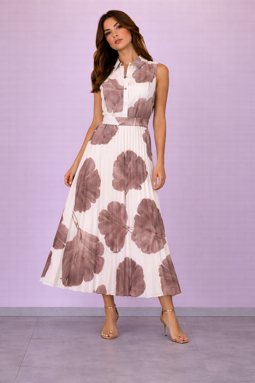Abito midi plissettato bianco con stampa floreale rossa e collo alto